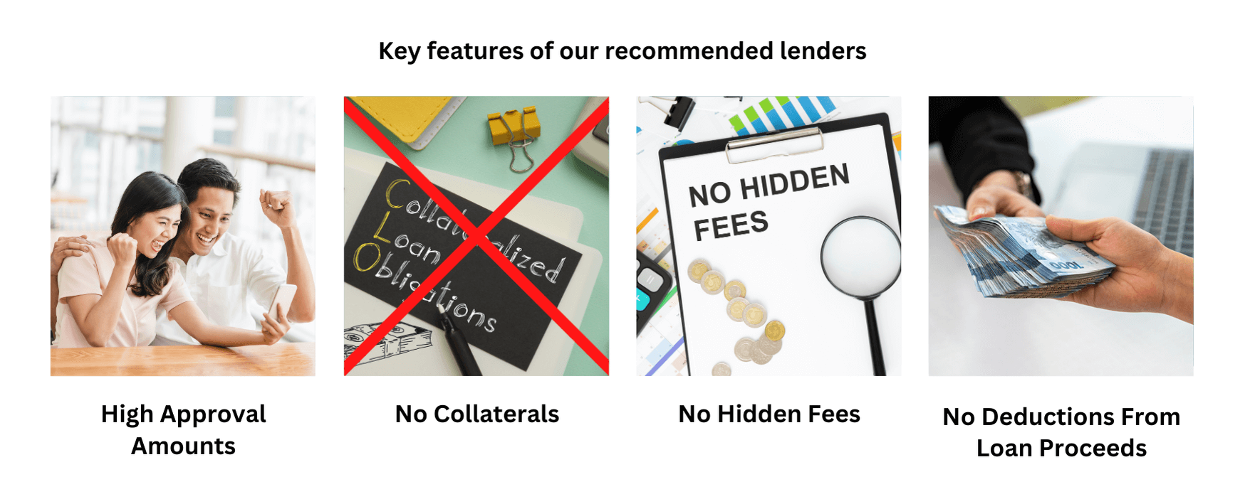 To ensure that your financial needs are satisfied, we chose companies not only the basis of reliability but also for their ability to offer the best value of your borrowings as their service features high approval amounts, no collaterals, no hidden fees and no deductions from your loan proceeds.